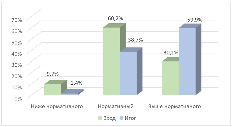 На рисунках 1–3 представлена динамика распределения детей по уровням развития по трем критериям диагностики: когнитивные процессы, воображение и социальный интеллект.Диаграммы отражают соотношение долей детей с различным уровнем сформированности показателей на входном и итоговом этапах: ниже нормативного, нормативный и выше нормативного.