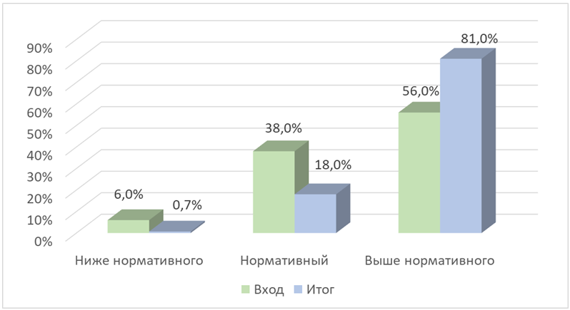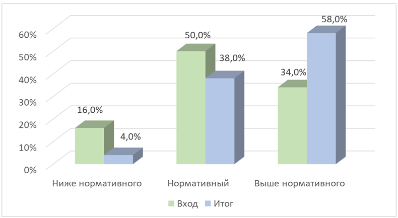 Как видно из данных рисунка 2, показатели развития воображения демонстрируют аналогичную положительную динамику.Доля детей с уровнем ниже нормативного снизилась на 12,0 % (с 16,0 % до 4,0 %), нормативный уровень уменьшился на 12,0 % (с 50,0 % до 38,0 %), а количество детей с уровнем выше нормативного возросло на 24,0 % (с 34,0 % до 58,0 %).Таким образом, можно отметить переход значительной части детей из категории ниже нормативного и нормативного уровня в категорию выше нормативного, что свидетельствует о развитии воображения и формировании конструктивно-образных способов мышления.