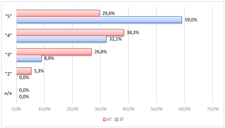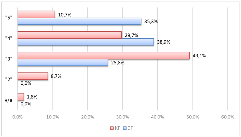 Распределение отметокпо предмету «Русский язык» также отражает более устойчивые достижения у учащихся СТЕМ-групп:38,9% получили оценку «4» и 35,3% – «5», тогда как в контрольной группе почти половина (49,1%) имелаотметку «3».Низкие отметки («2») в экспериментальной группе не встречаются (0%), в то время как в контрольной группе такие показатели составляют 8,7%. Стандартное отклонение в СТЕМ-группе (0,72) ниже, чем в контрольной (0,81), что свидетельствует о большей однородности и устойчивости результатов.